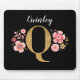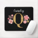A beautiful, feminine monogrammed pink floral mouse pad, featuring pink flowers and a faux gold monogram letter Q on a black background. Personalise the mouse pad by adding your name underneath the monogram. Makes a fun gift for a friend or for a bridesmaid gift. Designed for you by Blackberry Boulevard.