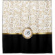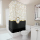 Classy bathroom shower curtain in a monogram design you can personalise with your own family or name initial. Designed in gold, black, and white with an abstract pattern that adds a touch of class.