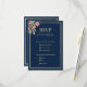 A classy navy blue background with gold handwritten script calligraphy ampersand and pink, coral, and gold watercolor floral wedding rsvp card.