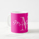 Classy neon pink name monogram coffee mug. Design your own personalized cup. Elegant monogrammed design. Pretty typography Birthday or favor gift idea for men, women, kids, friends and family. Stylish script typography template. Custom color for name initial letter and background. Unique coffee mugs also available in extra large oversize drinkware and big to go travel mugs. Great for home and office.