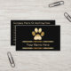 Upscale pet care business cards you can customise with simple classy design that includes a gold printed dog paw print, gold printed line design elements, and classic text layout. Best business cards for themes related to dog grooming, pet grooming, pet salon or kennel, day care or pet sitter.