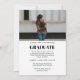 A classy modern graduation announcement and invitation card with a stylish script, text overlay, and two (2) photos (full portrait photo at the front and half card landscape photo at the back). Photos and details are easy to personalize and customize.
