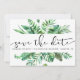 Modern and simple save the date postcard appears at the centre among foliage as text overlay in black brush modern lettered typography and a template postcard is on the back.
