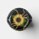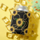 Can cooler with an elegant and stylish pattern. Pretty yellow sunflowers and green leaves surrounded by delicate gold chains. Black background.