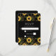 A wedding RSVP card with an elegant and stylish pattern. Pretty yellow sunflowers and green leaves surrounded by delicate gold chains. Black background.