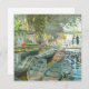 Claude Monet. Bathers at La Grenouillère. Summer landscape in green tones. There are several boats on the river bank. In the middle shot there are people standing on the pier. There is a blue sky in the background. Reproduction of famous works of art images in the public domain.