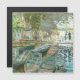 Claude Monet. Bathers at La Grenouillère. Summer landscape in green tones. There are several boats on the river bank. In the middle shot there are people standing on the pier. There is a blue sky in the background. Reproduction of famous works of art images in the public domain.