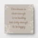 This pretty word art plaque features a tan background, almond coloured floral swirls and text that reads, "Our house is clean enough to be healthy but dirty enough to be happy".