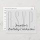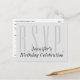 This clean and respectable R.S.V.P. postcard design features the message "R.S.V.P." on the front, along with a customisable occasion name. It also features a custom RSVP form on the back for the recipient to complete, along with a custom address that the completed RSVP cards would be mailed to. RSVP cards like this could perhaps be used to find out who will be attending a wedding reception, a Christmas party, a retirement party, or some other celebration.