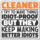 Funny Cleaner Sayings "Cleaner I Try To Make Things Idiot Proof But They Keep Making Better Idiots". Grab this Funny Cleaner design as a funny gifts for an awesome mum, dad or friend.