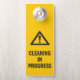 Cleaning in progress caution door knob hanger in black on caution yellow with a caution alert symbol. Cleaning service can hang on bathroom door or other business use to worn people the room is closed for cleaning. Same design on both sides.