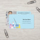 A light blue background decorated with cleaning equipment. Personalise and add Your photo, name, text contact info and your own QR code to your website address. Black text.