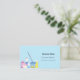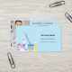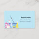 A light blue background decorated with cleaning equipment. Personalise and add Your photo, name, text contact info and your own QR code to your website address. Black text.