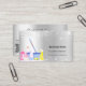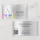 An elegant and glamourous business card on a faux silver metallic looking background decorated with faux glitter dust on front and cleaning equipment. Personalise and add Your name, text contact info and your own QR code to your website address.