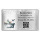 An elegant and glamourous business card on a faux silver looking background decorated with faux glitter dust on front and cleaning equipment. Personalise and add Your name, text, contact info and your own url to your website or your social media account to the QR code.