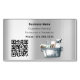 An elegant and glamourous business card on a faux silver looking background decorated with cleaning equipment. Personalise and add Your name, text, contact info and your own url to your website or your social media account to the QR code.