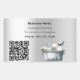 An elegant and glamourous business sticker on a faux silver looking background decorated with cleaning equipment. Personalise and add Your name, text, contact info and your own url to your website or your social media account to the QR code.