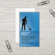 In this Cleaning Services business card, the silhouette of a man using a mop forms the main image over a striped gradient blue background. Customise this card immediately with your name and details.