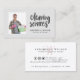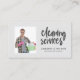 Modern photo business card designed for a commercial or residential services for cleaning, housekeeper, maid service, or janitorial supplies. Design featuring of single photo, typography script ''cleaning services'' in dark gray color, name and text line on the front. Customize the back with your full contact details and social media details.