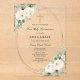 Elegant white roses are nestled in sage green leaves and decorate a gold fame. A gold cross tops the text. Acrylic invitations are the hottest design trend of the season.