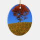 A peaceful 3D landscape in fall, created in Vue. On top of a hill covered with tall golden grass, against a clear blue sky, a solitary orange maple stands with a wooden bench under it to stop and rest on.