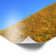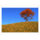 A peaceful 3D landscape in fall, created in Vue. On top of a hill covered with tall golden grass, against a clear blue sky, a solitary orange maple stands with a wooden bench under it to stop and rest on.