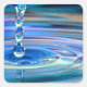 Clear blue water drops flowing into a pool of water. The water is rippling in circles and there are colourful reflections in the water in an abstract pattern.
