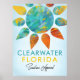 Bright, colourful Clearwater Florida design that is 100% Sunshine approved. Warm colours of red, orange, turquoise and aqua in a watercolor style pattern on a pretty blue shaded background.