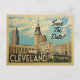 Vintage Cleveland Save The Date postcards featuring a city skyline view. This cool mid-century retro design is the perfect way to gather guests to your Cleveland Ohio destination wedding.