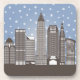 Artistic render of Cleveland's skyline in a chocolate, silver, and winter blue colour scheme with snowflakes backdrop.