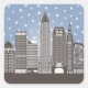 Artistic render of Cleveland's skyline in a chocolate, silver, and winter blue colour scheme with snowflakes backdrop.