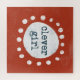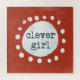 A bold red background features the phrase "clever girl" at the centre, enclosed by a ring of white dots surrounding a larger white oval. The playful and simplistic design emphasizes the central message.