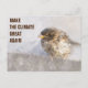 Photo of a wet unhappy sparrow. Text Make the climate great again. Climate change awareness horizontal postcard. You can change or delete the image and the text.