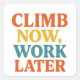Celebrate your passion for adventure with this bold “Climb Now, Work Later” sticker. Featuring retro-inspired typography in vibrant orange, yellow, and teal, this design is perfect for rock climbers, hikers, and outdoor enthusiasts. Stick it on your gear, water bottle, or laptop for a fun reminder to prioritise adventure. A must-have for weekend warriors and nature lovers alike.