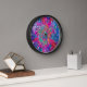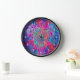 Clock with hot pink and blue abstract floral design with a black wood frame. The numbers are white.