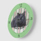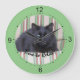 Black cat relaxing on striped cushions. Cushions are green, red, beige and white vertical stripes. Outer rim of clock is matches the red in the cushions. Beneath the cat is text "Time to Relax!"