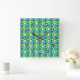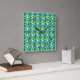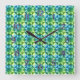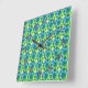 Quilt block in "spool" pattern. Eight spools in blue and green, rotate around a centre of green. A blue-green flower print is the "thread" on the spool, as well as the frame for each block. Replication of block gives a kaleidoscope pattern. Numbers are black with 3D look and drop shadows in blue and light green.