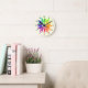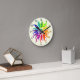 Colours of a standard colour wheel are depicted in stylised leaves reaching for the numerals on the clock face. Background is a pale yellow. Two collections of coloured leaves (one large, one smaller) are off-set slightly. Warm colours (yellow, orange, red) are marking the afternoon hours. Cool colours (purple pink, green) mark the evening hours. Great gift for the visual artist.