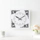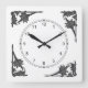 Angled "wrought iron" leafy bracket replicated in each corner. Image is black on white background. Clock face is circle with minute marks surrounding the twelve numerals.
