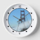 Towers of Golden Gate bridge poke through clouds of fog that rest on the roadway. Black numerals appear on a white background in a circle resembling a porthole.