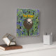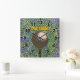 Tee Time! Golf ball atop a tee, sits against a background of green, blue, yellow and purple dots. Black numerals and minute markers.