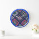 Granny square patterned afghan in multiple colours. Framed with a blue ring that looks 3D. White numerals .
