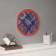 Granny square patterned afghan in multiple colours. Framed with a red ring that looks 3D. White numerals .