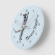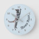 Cat standing on hind legs, swiping paw at 12. Curved text at right reads "Meow Time" Numerals are white with grey drop shadow, background is light blue.