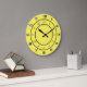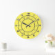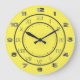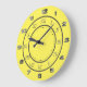 Roman and Arabic numerals shown in outer rings. Minute hash marks on inner circle. Numerals in metallic looking silver colours, dividing rings in dark grey, all on a cheerful yellow background.