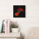 A clock design that shows a red acoustic guitar. The photograph is taken diagonal, up close to the head of the guitar, located at the bottom left, going upwards, following the fingerboard, towards the vague body of the guitar at the top right part of the picture. Only the four main hour numbers (i.e. 12, 3, 6, 9) are displayed in golden/orange colour. The background is black, which makes the red instrument really stand out!