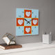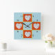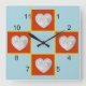 Heart shaped frames on blue background. Family pictures, or ? Show in the 12, 3, 6, and 9 spots on this "patch work quilt" clock. Your square images will be placed within the red heart shaped frame. Background may be Customised/edited to colour of your choice. (Defaults to light blue)