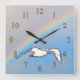 White gull is flying against a backdrop of a rainbow hued sky. Bird is outlined in rainbow colors. Above rainbow band, sky is gray, below, sky is blue. Numerals are golden with black outlines.