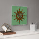Graphic image of ship's wheel in brown with black shadow. Background is medium green. Black numerals are at 12, 3, 6, and 9 positions