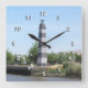 Lighthouse on the Suisun Harbour, Suisun City, Solano County, California. Built 2006, 52-foot-tall. Blue sky and placid water highlight the light and dark grey stripes of this landmark. White numerals with drop shadow.